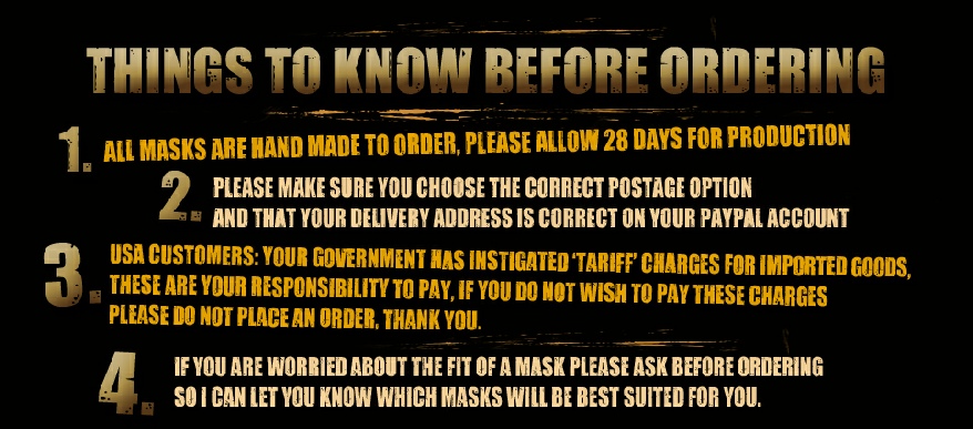 ALL MASKS ARE HAND MADE TO ORDER . ALLOW 28 DAYS FOR PRODUCTION